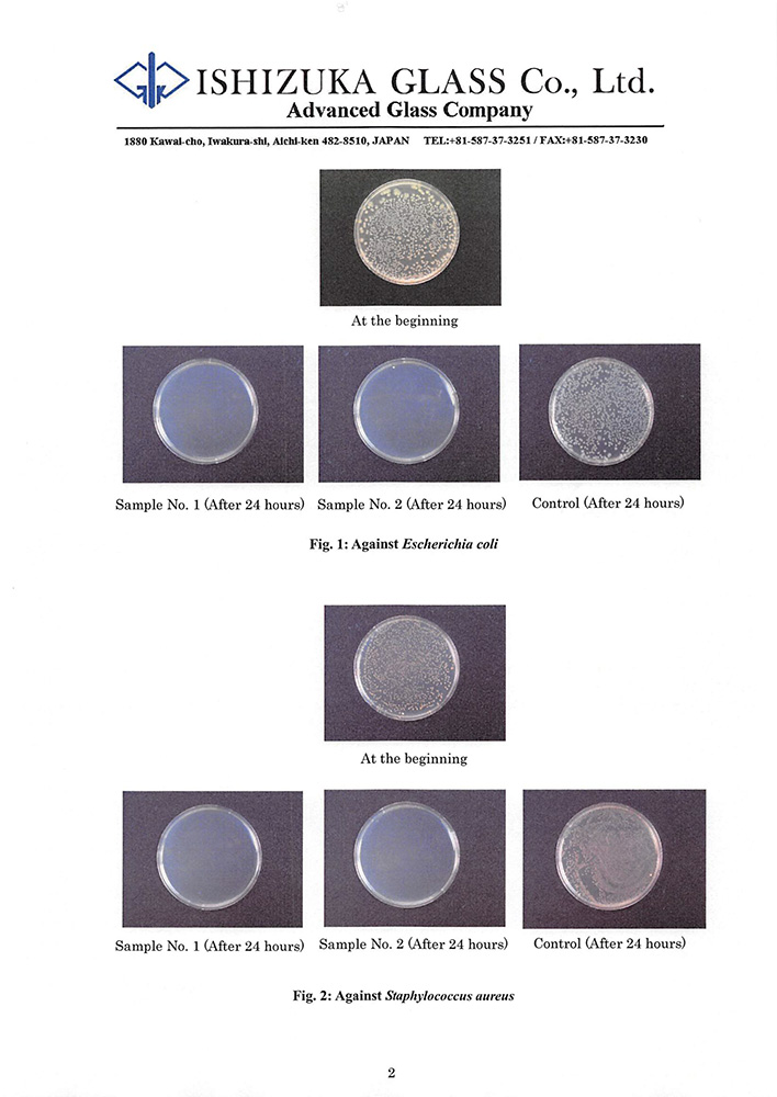 The “Antimicrobial8” treatment was subjected to antibacterial efficacy tests performed in biological laboratories according to the JIS Z 2801: 2000 standards using two of the most common bacteria:
