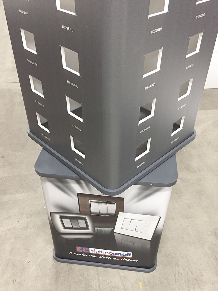 A practical and innovative solution, even on a large scale – standing a full 200 cm tall – featuring a rotating top section for a better view of the product range. Easy to set up and fully graphic, this portable display unit is designed with pre-drilled holes for inserting the electrical panels on display.